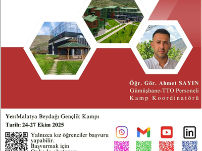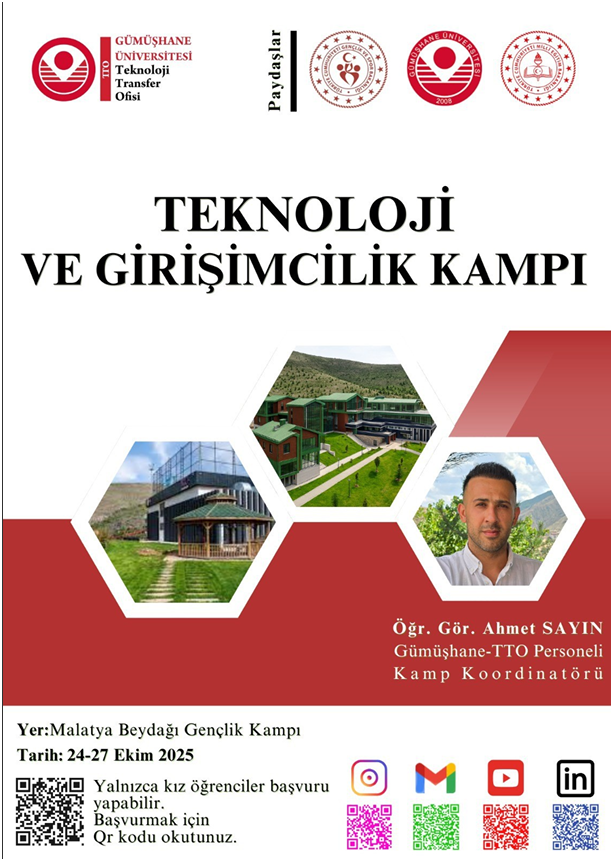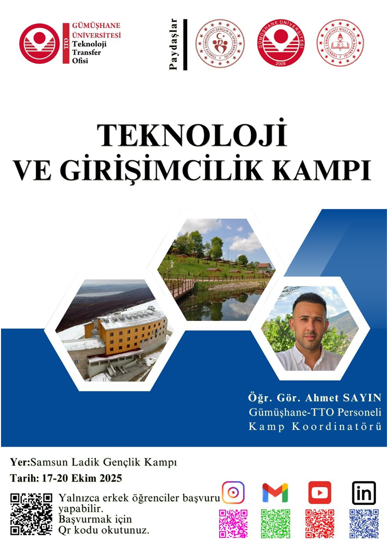 Üniversitemizde öğrenim gören önlisans/lisans öğrencilerinin katılımıyla 17-20 Ekim 2025 tarihlerinde Samsun ili Ladik ilçesinde “1. Teknoloji ve Girişimcilik Kampı (Erkek Kampı)” ve 24-27 Ekim 2025 tarihlerinde Malatya ili Battalgazi ilçesi Beydağ’da “2. Teknoloji ve Girişimcilik Kampı (Kız Kampı)” gerçekleştirilecektir. Kamplarda öğrencilerimizin teknoloji, bilişim ve girişimcilik alanında bilgi-becerilerinin geliştirilmesi, yenilikçi fikirlerini projeye dönüştürmeleri ve takım çalışması deneyimi kazanmaları amaçlanmaktadır. Kamp etkinliklerine katılım sınırlı sayıda olup her bir kamp başvurusu için ekte sunulan afişlerde yer alan karekod aracılığıyla ilgili formun doldurulması gerekmektedir.